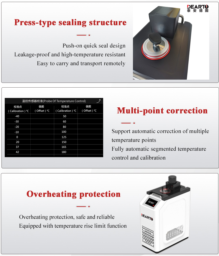 DTS-125BG Portable Smart Refrigerated Calibration Bath is a kind of high precision automatic temperature calibration device, which has the characteristics of stable performance, uniform temperature field, accurate temperature control, etc. Fully enclosed refrigeration system, intelligent PID adjustment to achieve automatic temperature control.